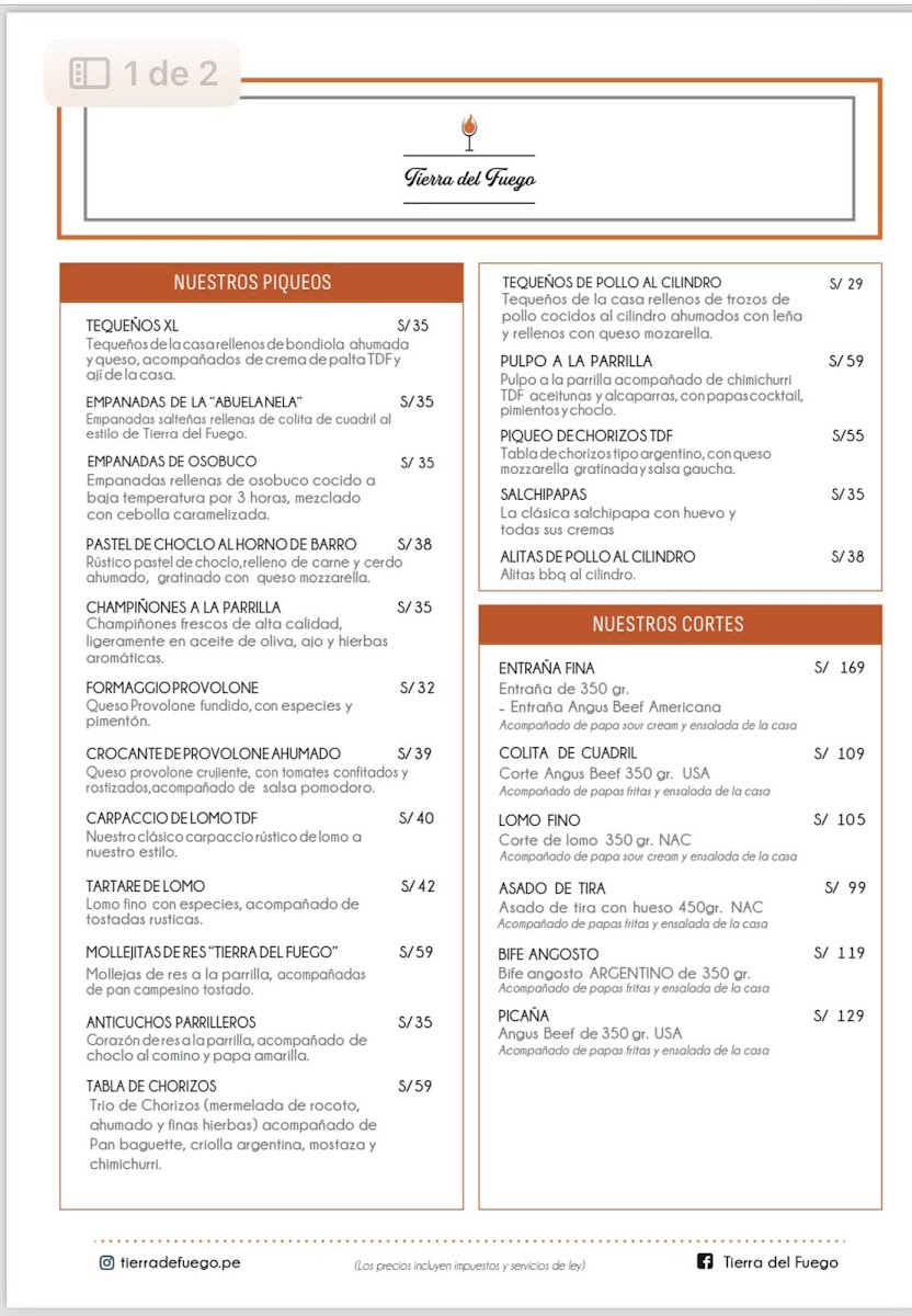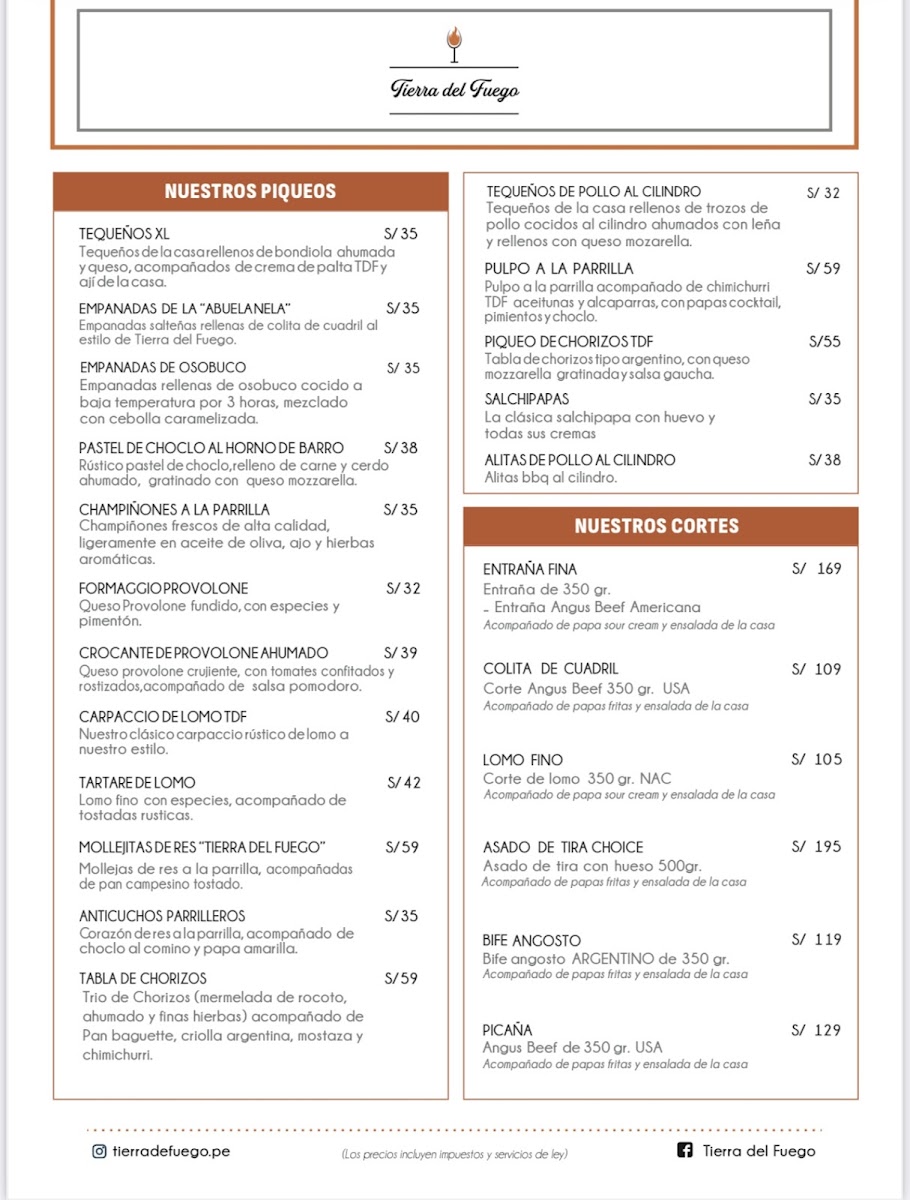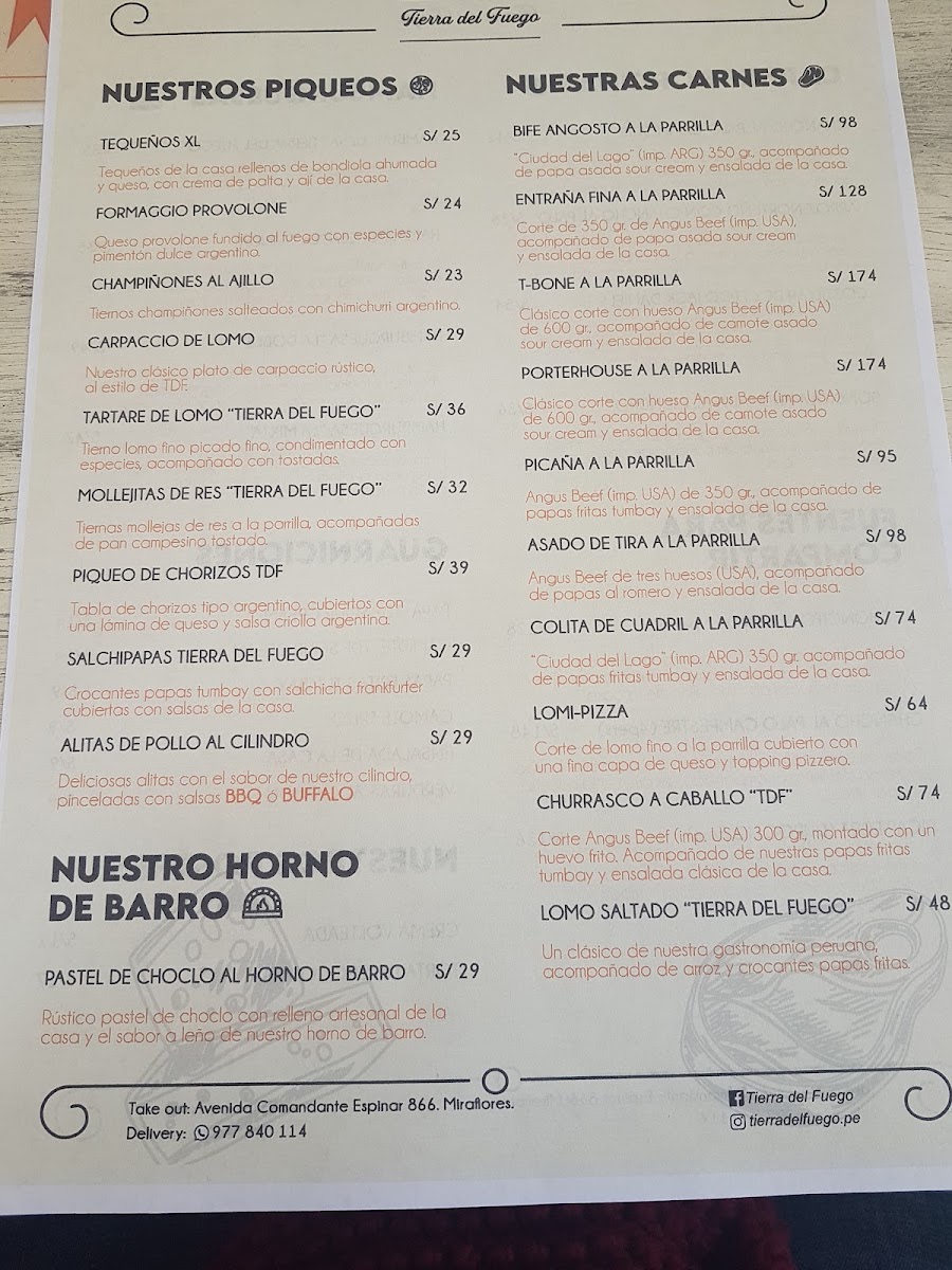 Tierra Del Fuego offers a vibrant and mouthwatering dining experience, with a menu that blends bold flavors and expertly crafted dishes. Among its standout offerings, the Tomahawk is a showstopper, delivering a tender and juicy steak that is perfect for meat lovers, while the Tartare de Lomo offers a fresh and flavorful twist on a classic dish. For those seeking refreshing cocktails, the Aperol Spritz and Maracuya Sour are standout choices, offering a balance of citrusy zest and smooth finishes. The Pulpo A la Brasa, grilled to perfection, highlights the kitchen’s mastery of seafood, while the Sangría offers a sweet, fruity refreshment that pairs wonderfully with the meal. The appetizers shine with Tequeños XL, which are crispy and savory, providing the perfect start to the meal. Finally, the Papa Asada, a beautifully roasted potato, serves as a comforting side that complements the main courses. Whether you're indulging in the rich flavors of the meat or enjoying a refreshing drink, Tierra Del Fuego's menu delivers a delightful experience that leaves a lasting impression.